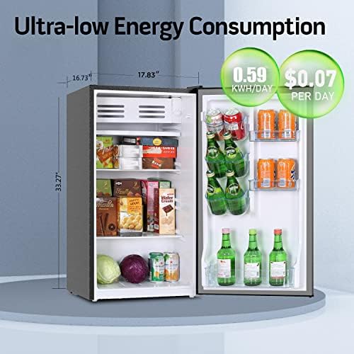 Small size but large capacity, size only 17.83 x 16.73 x 33.27 inches and Capacity of 3.1 Cu.Ft. This compact refrigerator conforms to energy star, the powerful compressor consumes only 0.59 kWh per day, about 0.07 usd per day. Silence technology let fridge is below 37 dB, which is very suitable for people who require quietness for living and working environments