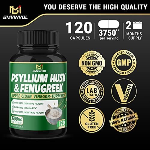 BMVINVOL Psyllium Husk Capsules 3750mg – Fenugreek, Apple Cider Vinegar, Turmeric – Fiber Supplement for Supports Digestive Health & Regularity (120 Count)