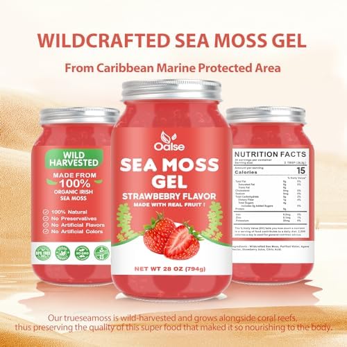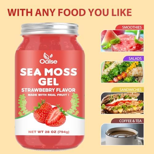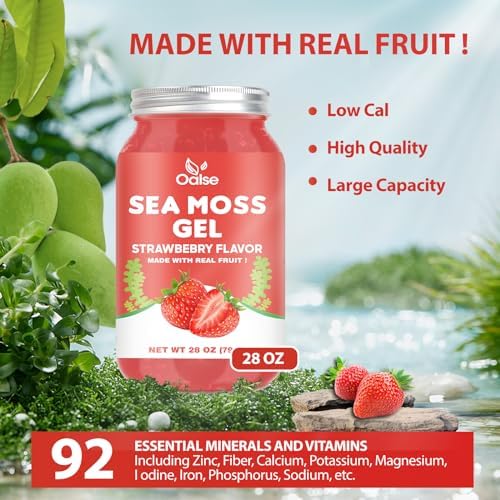 (28OZ Organic Sea Moss Gel Strawberry Flavored – Natural Seamoss Gel with 92 Minerals and Vitamins – Non-GMO, Gluten-Free, Vegan – Immune Defense Thyroid Digestive Support