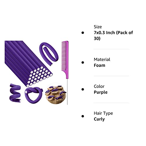 30 Pieces Flexible Curling Rods Twist Foam Hair Rollers Soft Foam No Heat Hair Rods Rollers and 1 Steel Pintail Comb Rat Tail Comb for Women Girls Long and Short Hair (Purple, 7 x 0.3 Inch)