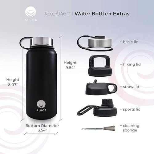 ALBOR Insulated Water Bottle with Straw, 32 Oz – 100% Leak-Proof with 4 Lids (2 Straw Lids) – Triple Insulated Stainless Steel Water Bottles, Reusable Water Bottle, Charcoal Black