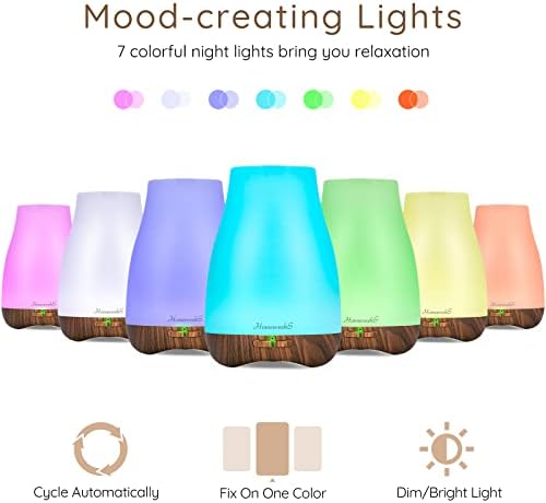 7 Color LED Light: The cute diffuser has 7 soothing colors, and room diffuser’s lights can be switched from dim to bright, cycled all the way or fixed to one color. Perfect for creating a cozy and quiet atmosphere, you can choose a different color each day of the week to match your mood that day