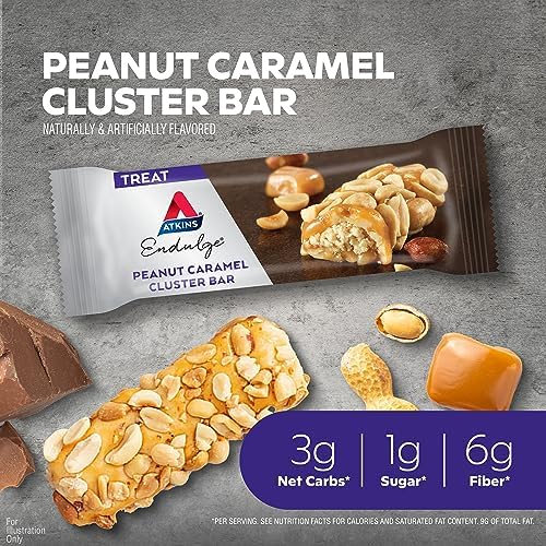 STAY ON TRACK. Our Peanut Caramel Cluster Bar provides 6 grams of protein and 6 grams of fiber per serving to help you achieve your daily goals. And, with 3 grams of net carbs and 1 gram of sugar per serving, this treat is perfect for a keto-friendly lifestyle. When used with Atkins ketogenic programs