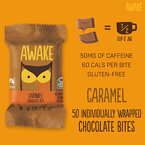 AWAKE – Caffeinated Chocolate Bites – Coffee Alternative – Low Calorie Snacks – Bite Size Energy Bars – 50mg of Caffeine in Each Bite – Non GMO – Gluten Free – Caramel Chocolate – 50 Bites