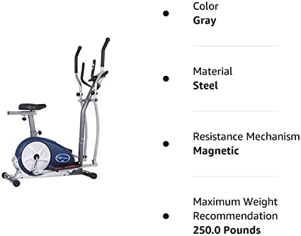 Designed to provide a multifunction workout, the Body Champ 2-in-1 Upright Exercise Bike and Elliptical Trainer features patented elliptical-motion design technology and an advanced magnetic resistance system. This exercise machine provides quiet and smooth rides with no impact to your knees, so you can get the best workout at home. Add it to your home gym, fitness studio, garage cycle studio, or wherever you like to work out. With a 2-way adjustable seat, 2 sets of ergonomic handlebars, a foam-padded seat cushion, and a step-through design, this dual-cardio trainer provides a customizable workout that almost anyone can use. It features a deluxe LCD console with 10+ preset workouts, heart-rate programs, and user-customizable programs, so you can make sure you’re getting a full workout every time you use it. The dual cardio trainer is an ingenious 2-in-1 exercise machine that serves as both an elliptical trainer and a stationary bike. This versatile machine can switch from mode to mode without interrupting your workout. The seat adjusts both vertically and horizontally for optimal comfort. Other highlights include a sturdy, oversized steel construction and a pass-through frame design. Built for durability and versatility, this machine has a 14-inch stroke length and a weight capacity of 250 lbs. Whether you’re a professional athlete, a bodybuilder, or a gym beginner, this cycle trainer is a great addition to your home or personal gym. Add the Body Champ 2-in-1 Upright Exercise Bike and Elliptical Trainer to your home-gym supplies today for a versatile machine that can help anyone reach their fitness goals.