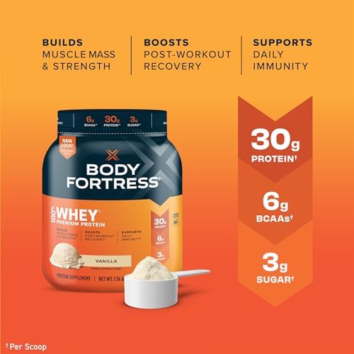 Packaging May Vary. Formula remains unchanged. 1 scoop contains 30g of protein. 2 scoops contain 60g of protein. This is your body. It’s the only one you’ve got, so give it the best with Body Fortress 100% Premium Whey Protein Powder. ǂ ◊ Not only does this no-nonsense formula offer 30 grams of protein and 6 grams of BCAAs (per scoop) to help dedicated athletes train harder and recover faster, but it also contains vitamins C & D plus Zinc to support daily immunity. ◊ Enjoy the creamy, delicious flavor of 100% Whey as it mixes perfectly into your go-to shake or smoothie! ◊ Disclaimers: ǂ 100% of Protein from Whey ◊These statements have not been evaluated by the Food and Drug Administration. This product is not intended to diagnose, treat, cure or prevent any disease