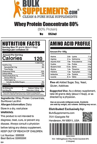 BulkSupplements.com Whey Protein Concentrate – Whey Protein Powder – Protein Powder Unflavored – Low Calorie Protein Powder – Protein Powder for Muscle Gain (1 Kilogram – 2.2 lbs)