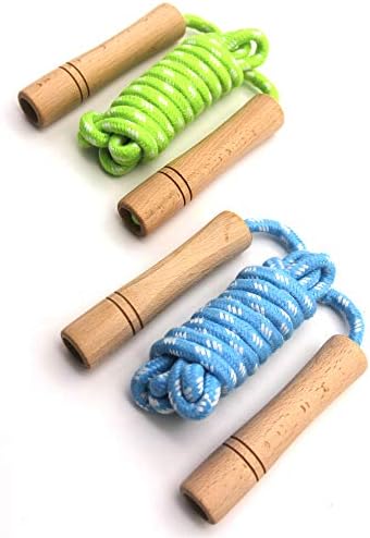 Cotton Jump Rope for Kids – Wooden Handle – Adjustable Cotton Braided Fitness Skipping Rope – Outdoor Fun Activity, Great Party Favor, Exercise Activity, Pack of 2 (Blue+Green)