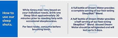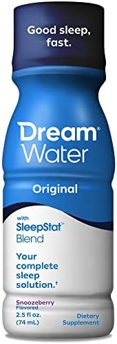 Good Sleep, fast in a convenient, single-use shot you can take when you need help with occasional sleeplessness, promoting deep, restful sleep. Great travel sleep companion. Dream Water Snoozeberry Sleep Aid Supplement is a liquid format, aiding in absorption. Contains natural flavors. Gluten-free.   No calories. Kosher. No added colors. No sugar. Sweetened with stevia. Dream Water’s SleepStat blend of Melatonin 5mg, GABA, and 5-HPT is formulated to help you sleep. Dream Water is a melatonin sleep aid that helps govern the body’s internal clock that regulates your natural cycle of sleeping and waking. Dream Water sleep products include a line-up of liquid sleep shots in Snoozeberry and Nectar flavors, Beauty Sleep Shots, Sleep Gummies, and Sleep Powder. Beauty Sleep Shots contain Biotin to help promote healthy skin, hair and nails, Dream Water Sleep Gummies are soft and delicious, and our Sleep Powder can be used as a sleep drink mix with hot or cold water, or taken with no water. Dream Water provides an alternative to sleep aid tablets and pills. Dream Water Sleep Aid Supplements are your complete sleep solution for occasional sleeplessness and the perfect nighttime sleep aid supplement. Get better Zzz with Dream Water. These statements have not been evaluated by the Food and Drug Administration. This product is not intended to diagnose, treat, cure, or prevent any disease.