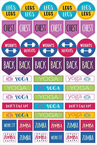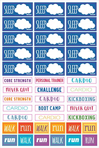 You’ll also find fill-in stickers to keep track of your workouts, stats, weight, calories burned, steps, sleep, water intake, goals, rewards, etc.Other stickers say ”Yoga,” ”Legs,” ”Walk,” ”Crunches,” ”Swim,” ”Cycle,” or depict fruits and veggies, tennis balls, soccer balls, and more.
