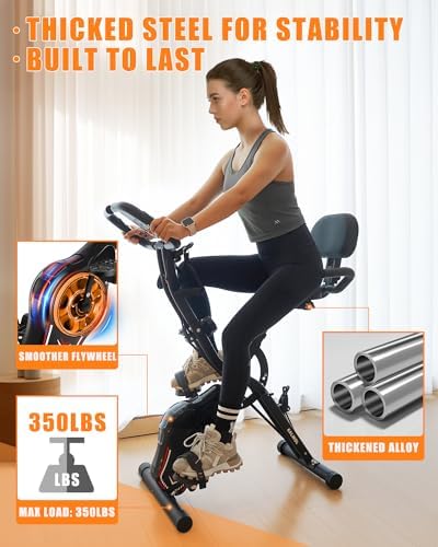 Folding Exercise Bike, 5-in-1 Foldable Stationary Bike Upgraded 16-level Magnetic Resistance 10DB Near-silent Bike Upright Indoor Exercise Bike for Home with Arm Resistance Band, Back Support Cushion