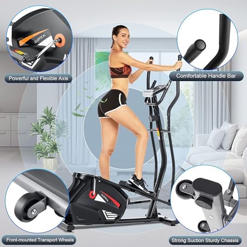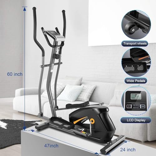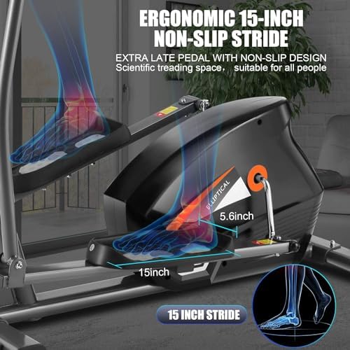 【Compact & Smooth Magnetic Driven】Advanced magnetic brake system and perfectly match belt drive will provide a safe, smooth and whisper quiet exercising environment. The compact elliptical trainer will not take up too much space and can be placed anywhere. Enlarged 15 inch anti-skip pedals and double handlebars will provide you most comfortable and suitable gesture for exercise. Portable wheels help you move it easily.