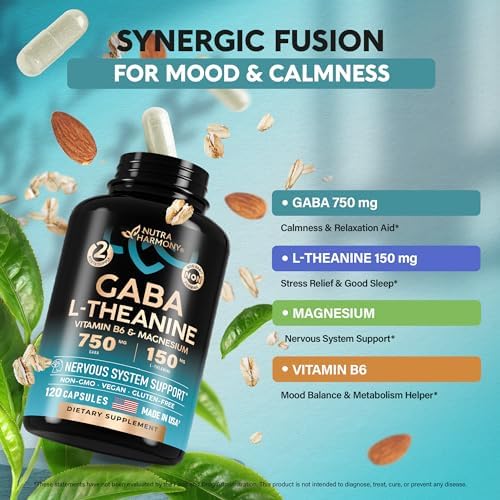 GABA L-Theanine – Stress Relief Supplement 900mg – Made in USA – Magnesium | Vitamin B6 – Natural Calm | Sleep | Relaxation | Mood Support – 750 mg Gamma AminoButyric Acid – 120 Vegan Non-GMO Capsules