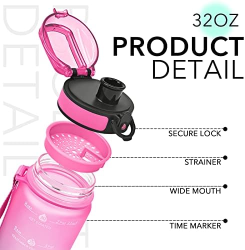 GOSWAG 32oz Motivational Sports Water Bottles with Time Marker(Without Straw) & Fruit Strainer, Times to Drink, Leakproof & BPA Free, Reusable Plastic Bottle with Strap no Straw for Gym & School