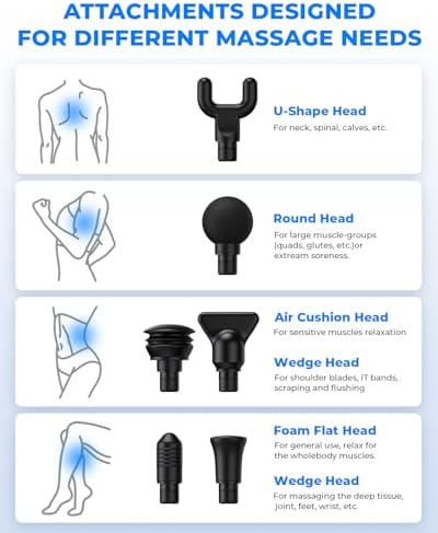 Versatile Massage Heads:This massage gun includes 6 interchangeable heads, allowing you to customize your massage experience. Each head is specifically designed to target different muscle groups and provide different types of stimulation.From deep tissue massage to a gentle relaxation session,our gun has got you covered.