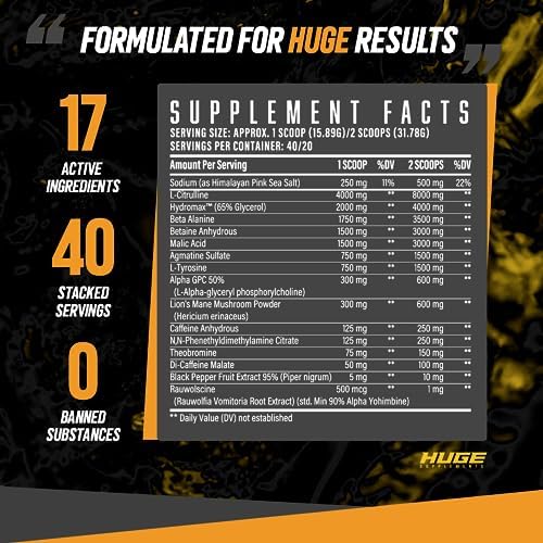 Huge Supplements Wrecked Pre-Workout, 30G+ Ingredients Per Serving to Boost Energy, Pumps, and Focus with L-Citrulline, Beta-Alanine, Hydromax, and No Useless Fillers, 40 Servings (Orange Burst)