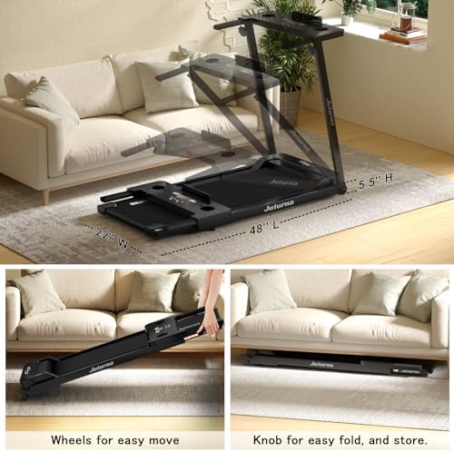 COMPACT & SAFETY: Juturna compact treadmill with knob and moving wheels for easy fold, move and store. When folded, it has a total dimension of just 48 L x 22 W x 5.5 H inches. The running belt of the portable treadmills for home is made of non-slip textured material, while protecting the knees, joints, muscle, lower back, hips, and ankles because of the anti-slip belt shock absorption features.