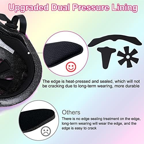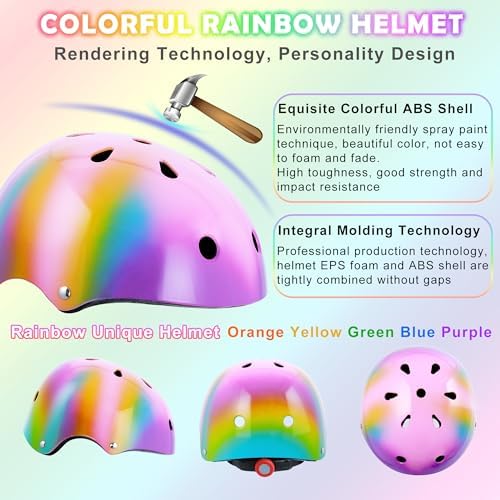 【Color Gradient Kids Bike Helmet】 Our kids skateboard helmet uses color elements of orange, yellow, green, blue, and purple to create a unique rainbow helmet. Equipe with knee pads and elbow pads set, effectively protects your kids from injuries during multi-sports, not only protects the baby but also delights the mood. The stylish kids bike helmet and knee pads set is an excellent gift for kids 3-8 years old.