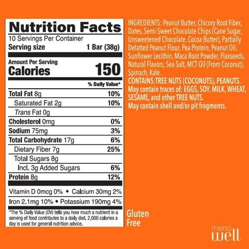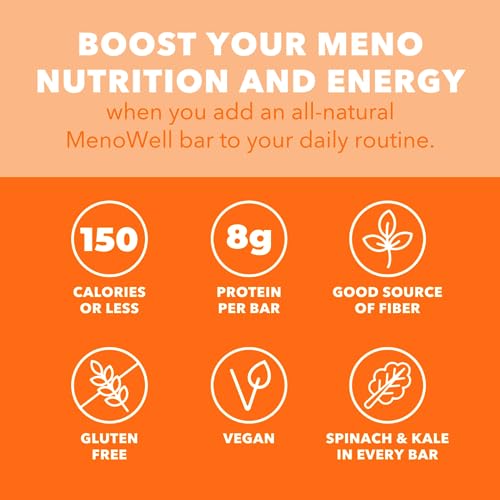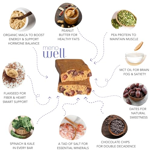 MenoWell Menopause Transition Trifecta – Armed with organic maca to help balance blood sugar and support hormones, probiotic fiber to feel full & satisfied, and 7-8 grams of plant protein to maintain muscle and boost metabolism. We’ve also included MCT oil from coconuts to boost brain function, dates for sweetness, flaxseed, spinach, and kale in every bar.