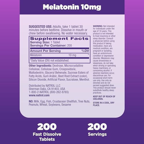 Natrol Melatonin 10mg Fast-Dissolve Tablets easily dissolve in the mouth to help you establish normal sleep patterns and get restful sleep.* Sourced from high-quality ingredients and 100% drug-free, this nighttime sleep aid supplement is also vegetarian, containing no milk, egg, fish, crustacean shellfish, tree nuts, peanuts, wheat, soybeans or sesame. This Natrol dietary supplement offers support for occasional sleeplessness, providing 10mg of 99% pure Melatonin to help you, fall asleep faster and sleep longer.* Natrol*s fast-dissolve formula and delicious strawberry flavor helps you fall asleep faster and stay asleep longer so you can get the sleep support you need anytime, anywhere. Adults, take one fast-dissolve Melatonin tablet 30 minutes before bedtime. No water is necessary. Break the sleep stress cycle with Natrol, the #1 drug-free sleep aid brand. (1) (1) Nielsen, xAOC, 52 weeks ending 4/1/23, Sleep Aid Supplements(1) Nielsen, xAOC, 52 weeks ending 4/1/23, Sleep Aid Supplements
