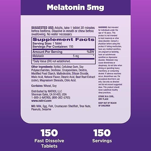 Natrol Melatonin 5mg Fast-Dissolve Tablets are a great-tasting sleep aid supplement that dissolves quickly in the mouth to help you get restful sleep and wake up feeling refreshed. Sourced from high-quality ingredients and 100% drug-free, this dietary supplement contains no synthetic dyes, artficial flavors or preservatives. These tablets are also vegetarian; containing no milk, egg, fish, crustacean shellfish, tree nuts, peanuts, wheat, soybeans or sesame. With 5mg of 99% pure Melatonin, this Natrol nighttime sleep aid supplement offers an easy-to-take to help with occasional sleeplessness, helping you fall asleep faster and stay asleep longer so you can recover and feel rested in the morning. Natrols fast-dissolve formula and delicious strawberry flavor helps you fall asleep faster and stay alseep longer so you can get the sleep support you need anytime, anywhere. Adults, take one fast-dissolve Melatonin tablet 30 minutes before bedtime. Dissolve in mouth or chew before swallowing. No water is necessary. Break the sleep stress cycle with Natrol, the #1 drug-free sleep aid brand. (1) (1) Nielsen, xAOC, 52 weeks ending 4/1/23, Sleep Aid Supplements