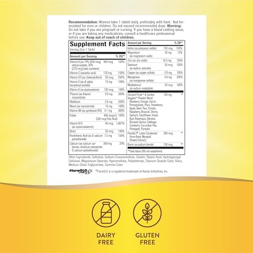 Nature’s Way Alive! Women’s 50+ Complete Multivitamin is a daily multivitamin optimized for women age 50+. Supports heart health, bone health, brain function, eye health, immune health, and energy metabolism.* Formulated with 100% or more Daily Value of 19 essential vitamins and minerals and is an excellent source of calcium and contains high potency vitamins B12 and D3. Contains food-based Orchard Fruits & Garden Veggies powder blend (100 mg per serving). *This statement has not been evaluated by the Food and Drug Administration. This product is not intended to diagnose, treat, cure, or prevent any disease.