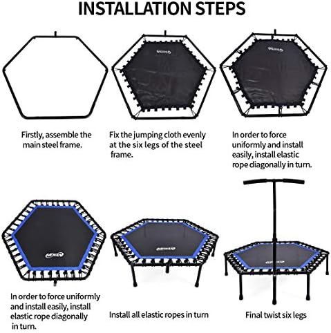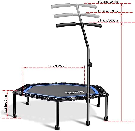 ✅【Package Details】:This trampoline for adults has and overall size of 48”, 30mm*1.5mm steel frame tube, 6 27mm*1.5 mm legs, 2 handrails( one 30mm*1.5mm, one 25mm*2mm), a heavy-duty pp jumping mat, and 42 bundles of latex filament bungee ropes. A 12KG Net weight; Size of 48”, 32.5mm above ground home trampoline. (when assembled.)