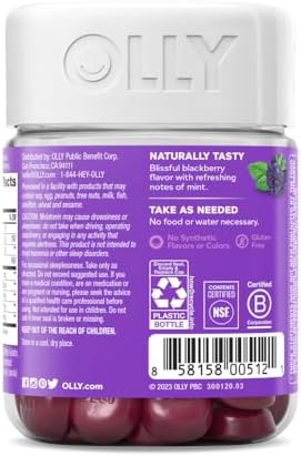 OLLY Sleep gummies for adults deliver a unique blend of active ingredients that work together to calm your mind and promote restful sleep so you wake up feeling refreshed. These Melatonin gummies, with L-Theanine and Botanicals like Chamomile and Lemon Balm, work with your body to help you fall asleep and stay asleep.* Naturally flavored with Blackberry and a hint of mint, Sleep gummy vitamins help you drift off. They’re naturally delicious, scientifically formulated and gluten-free. Good health is at the center of everything we do. That’s why we’ve made it our mission to make nutrition easy to understand. We do it by crafting products that are as effective as they are delicious—because we know when something feels good, you’re more likely to do it.* *These statements have not been evaluated by the Food and Drug Administration. This product is not intended to diagnose, treat, cure or prevent any disease. For occasional sleeplessness. CAUTION: Melatonin may cause drowsiness or sleepiness; do not take while driving, operating machinery, or engaging in any activity that requires alertness.