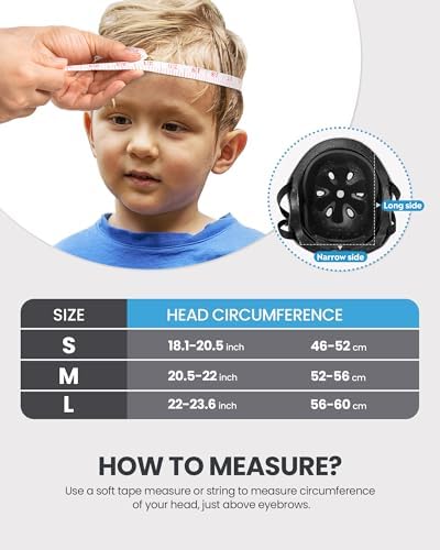 HOW TO MEASURE A PROPER HELMET? – To find the right size bike helmet, start by measuring your head circumference, wrap a flexible tape measure around the largest portion of your head??about one inch above your eyebrows. Or, wrap a string around your head, then measure the length of string with a yardstick. Size Large is recommended if your size is between 21.3-22.8inch (54cm-58cm). Recommended Age Grade for this helmet: 5 years and older.