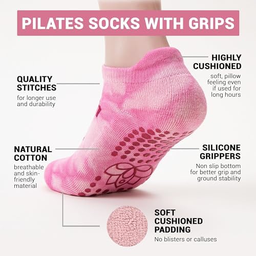 Primo Lines 3-Pack Barre Socks with Grips for Women Tie-Dye Non Slipper Socks with Grippers for Women in Pink, Blue, Violet – Low Cut Ballet Socks for Women – Workout Gripper Socks for Women