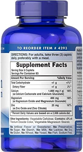 Puritan’s Pride offers a high quality Calcium / Magnesium / Zinc supplement that delivers 1000 mg Calcium, 400 mg Magnesium and 25 mg Zinc in one convenient form for optimal nutritional support. Calcium is the primary mineral responsible for strong bones. The body cannot produce calcium, so proper amounts must be ingested in order to provide the body with this essential nutrient. Calcium and magnesium play roles in proper bone mineralization, muscle contractions and nerve impulses. Zinc helps support immune function and plays a role in over 300 enzymes in the body. Adults can take three caplets daily with a meal. These statements have not been evaluated by the Food and Drug Administration. These products are not intended to diagnose, treat, cure or prevent any disease.