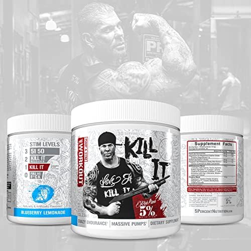 Rich Piana 5% Nutrition Kill It Pre Workout Powder w/Creatine, Jitter-Free Caffeine, NO-Booster, Beta Alanine, L-Citrulline for Focus, Pump, Endurance, Recovery 13.23 oz, 30 Srvgs (Blueberry Lemonade)