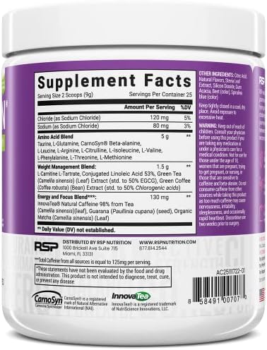 Taurine, L-Glutamine, CarnoSyn ®, Beta Alanine, L-Leucine, L-Arginine, L-Citrulline, L-Isoleucine, L-Valine, L-Phenylalanine, L-Threonine, L-Methionine, L-Carnitine, L-Tartrate, Conjugated Linoleic Acid 53%, Green Tea (Camellia sinensis) (Leaf) Extract (std. to 50% EGSG), Green Coffee (Cofee robusta) (Bean) Extract (std. to 50% Chlorogenic acids), InnovaTea ® Natural Caffeine 98% from Tea (camellia sinensis) (leaf), Guarana (Paullinia cupana) (seed), Organic Matcha (Camellia sinensis) (Leaf), Citric Acid, Natural Flavors, Stevia Leaf Extract, Silicon Dioxide, Gum Acacia, Beet (Color), Spirulina blue (color)