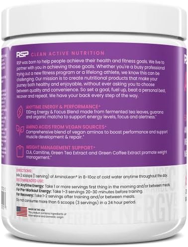 RSP AminoLean – All-in-One Natural Pre Workout, Amino Energy, Weight Management – Vegan BCAAs, Preworkout for Men & Women, Acai, 25 Serv