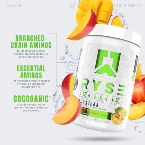 RYSE Up Supplements Core Series BCAA+EAA | Recover, Hydrate, and Build | with 5g Branched Chain Aminos and 3g Essential Aminos | 30 Servings (Peach Mango Tea)