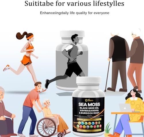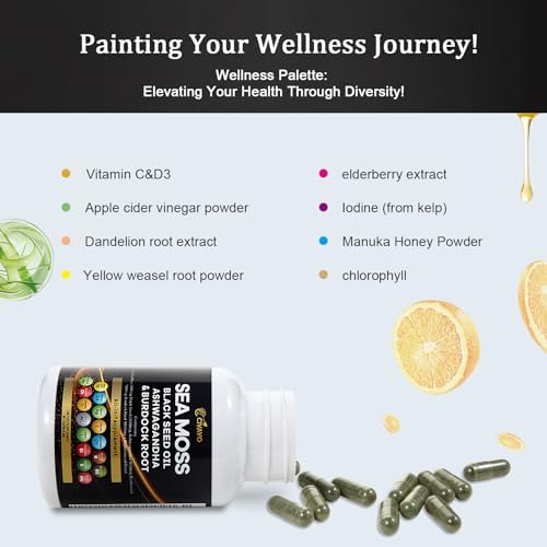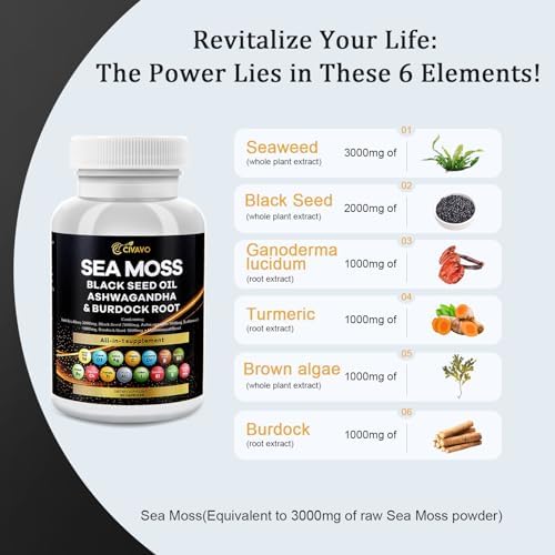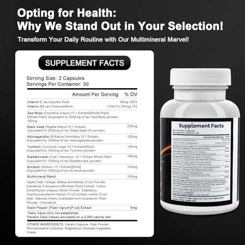 Sea Moss 3000mg Black Seed Oil 2000mg Ashwagandha 1000mg Bladderwrack 1000mg Turmeric 1000mg Burdock 1000mg Vitamin C & D3 Elderberry Manuka Dandelion Yellow Dock Chlorophyll ACV