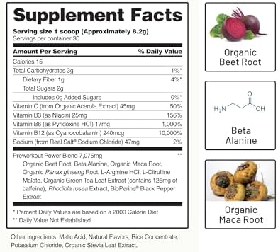Organic Beet Root Powder, Beta Alanine, L-Arginine HCI, Citrulline Malate, VegiSURGE Caffeine, Rhodiola Rosea Root Extract, OxyStorm Red Spinach Extract, BioPerine Black Pepper Extract, Vitamin C (Ascorbic Acid), Vitamin B3 (Niacinamide), Vitamin B6 (Pyridoxine HCI), Vitamin B12 (Cyanocobalamin), Sodium (Real Salt Sodium Chloride), Natural Flavors, Malic Acid, Potassium Chloride, Organic Stevia Leaf Extract, Rice Concentrate