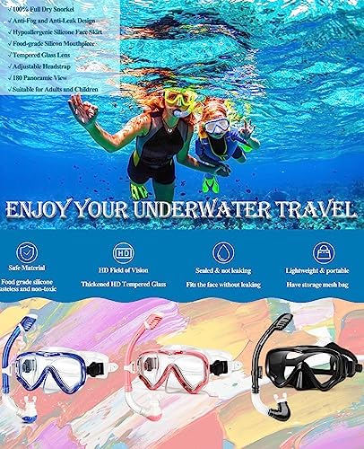 Snorkel Mask Set Snorkeling Gear Dry Snorkel Set and Mask Kids Adults Anti Fog 180 Degree Seaview with Mesh Bag, Scuba Diving Swimming Training Equipment Men Women
