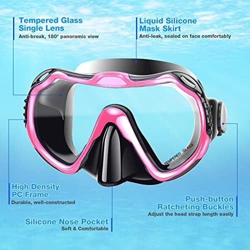 🤿【 EASY ADJUST TO FIT ALL FACE 】 The snorkeling goggles has adjustable straps with an anti-slip locking mechanism on both sides. Adjusting elastic silicone strap to fit snugly and the improved scuba mask fit different face shapes well. The soft silicone material and ergonomic skirt design provides comfortable fit.