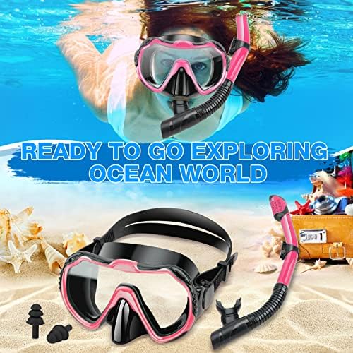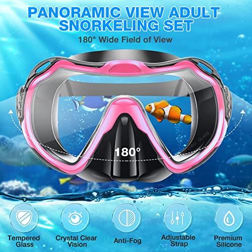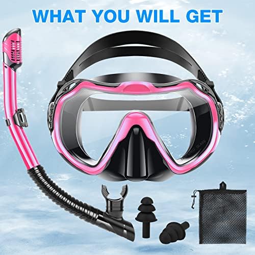 Snorkeling Gear for Adults, Dry Snorkel Set, Panoramic Anti-Leak and Anti-Fog Tempered Glass Lens, Adjustable Snorkeling Gear with Mesh Bag Ear Plug for Snorkeling Scuba Diving Travel