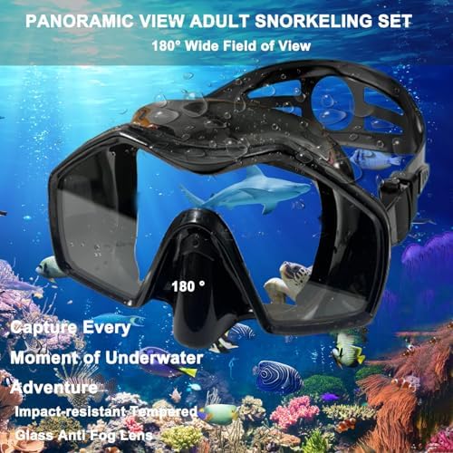 ð€¿ãPanoramic View Snorkel MaskãThe scuba gear mask features shatter-resistant tempered galss lenses, embedded anti-fog, and a soft face skirt for a comfortable, leak-free seal.The Snorkelling Mask gives 180°Panoramic view and a comfortable fit with the soft silicone skirt.The anti-fog treated lens provides an ultra clear vision of the aquatic world.swimming snorkel for swimming laps excellent mask for beginner divers or snorkelers.