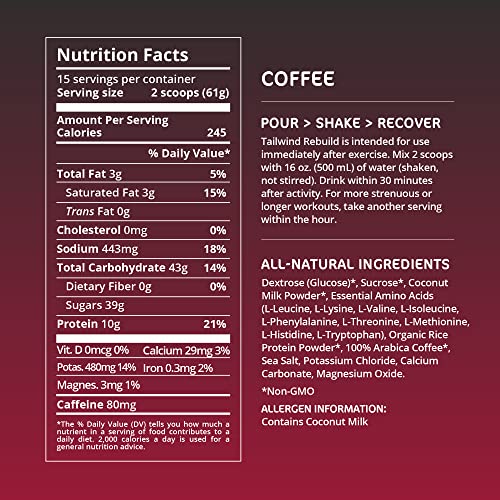 Tailwind Nutrition Rebuild Recovery Drink Mix, Complete Protein with Electrolytes and Carbohydrates, Free of Gluten, Soy, and Dairy, Vegan, 15 Servings, Coffee