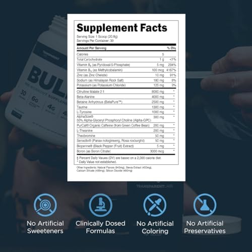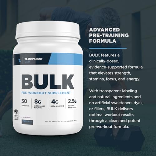 Science-Backed Formula: Transparent Labs Bulk Pre-workout is distinguished by its extensive, evidence-based formula that includes key ingredients such as Citrulline Malate, Beta-Alanine, Betaine Anhydrous, Taurine, L-Tyrosine, AlphaSize Alpha-GPC, and more. This carefully crafted blend is designed to provide a holistic boost to your workout performance, ensuring you have the necessary tools to push your limits and achieve your fitness goals.