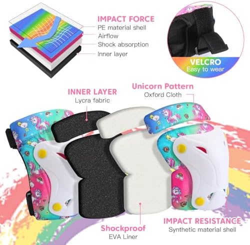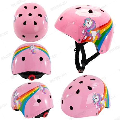 Unicorn Kids Bike Helmet offer the highest level of protection to your kids from beginner to professional. This helmets are flexible and suitable for various sports activities, including cycling, skateboarding, and scooting. Unicorn helmet uses ABS shell + EPS inner shell + sponge lining, shock-absorbing EPS foam, which can effectively absorb impact and protect the head. Set includes 1x kids helmet, 2x elbow pads, 2x knee pads, and 2x wrist guards. Blue, purple, red, pink, various colors to choose from. The unicorn helmet and protective gear set provides your child with more safety and fun. It is a good choice as a gift for Children’s Day, Christmas, Birthday, Halloween, Thanksgiving and other festivals. Helmet for Kids 3-5 about Size: Universal Size, Our bike skateboard helmet’s head circumference S :19.6 – 21.2 inch(50-54 cm) suitable for 3-8 years old kids; M : 20.8 – 22.8 inch (53-58 cm) suitable for 8-14 years old Youth.