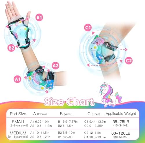 🚲【Suits Your Kids】Helmet Size: 9.45*8.27*5.9 Inch. Bike helmet suitable for 3-8 years old kids and toddlers of head circumference: 50-54 cm / 19.6-21.2″. 3 in 1 Protective Gear Set Size: S is for children aged 3-8, and the recommended weight is 33-55 lbs (15-25 kg).