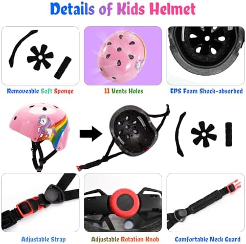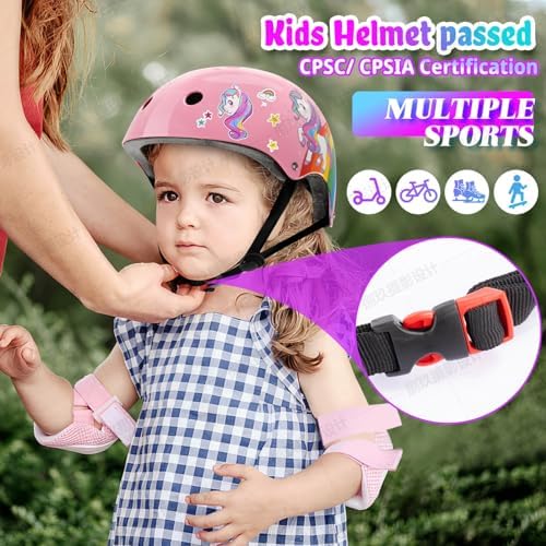 🚲【Adjustable Toddler Helmet for Kids with DIY Stickers】Package including: 1*helmet, 2*Wrist Pads, 2*Knee Pads, 2*Elbow Pads, 2 DIY stickers and 1 Cute Self-Design Unicorn Drawstring Backpack. Helmet adjustable dial & skin-friendly adjustable chin strap maximizes optimal fit and comfort.