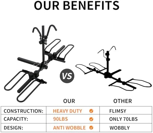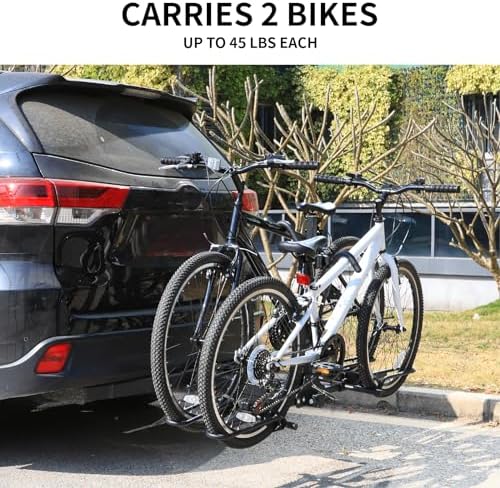 ✅ HIGH COMPATIBILITY : Fit 20-26 inch wheels, fit 28.5″ to 60.5″ bike wheelbase, up to 2.5 inch tires, come with 2 inch hitch perfect for your cars, trucks, SUVs, minivans. Also comes with an Hitch Tightenerto minimize wobble of bikes during transport.