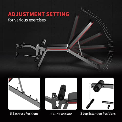 đ„ ăFull Body FitnessăThe weight bench features a secure sawtooth back pad adjustment design that can be modified to an incline, flat, or decline position, allowing you to do a variety of exercises, such as sit-ups, push-ups, leg curl and extension, dumbbells, hamstring curls, bench press, pull rope and so on