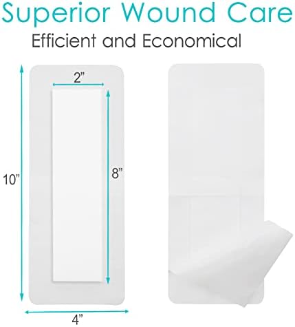 【Absorbent Center Pad & Adhesive Boarder】While the overall dimensions of the dressing is 4 x 10 inches, the center core pad (which is what you will place over a wound) measures 2 x 8 inches. The center portion is soft and absorbent, the surrounding adhesive portion sticks nicely to the skin and stays put and does not tear the skin off when you remove the pad. This dressing protects the wound from the elements, keeps it clean and is cushiony enough to protect it from further pain and damage.