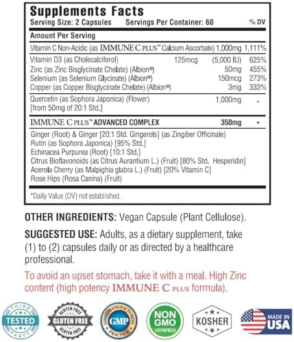 (120 Capsules), Quercetin 1,000mg, Vitamin C 1,000mg, Zinc 50mg, Vitamin D3 5,000iu, Selenium, Copper, Acerola, Ginger, Rutin, Bitter Orange, Rose Hips, Echinacea, Immune C Plus, 12 in 1 Immune C Plus